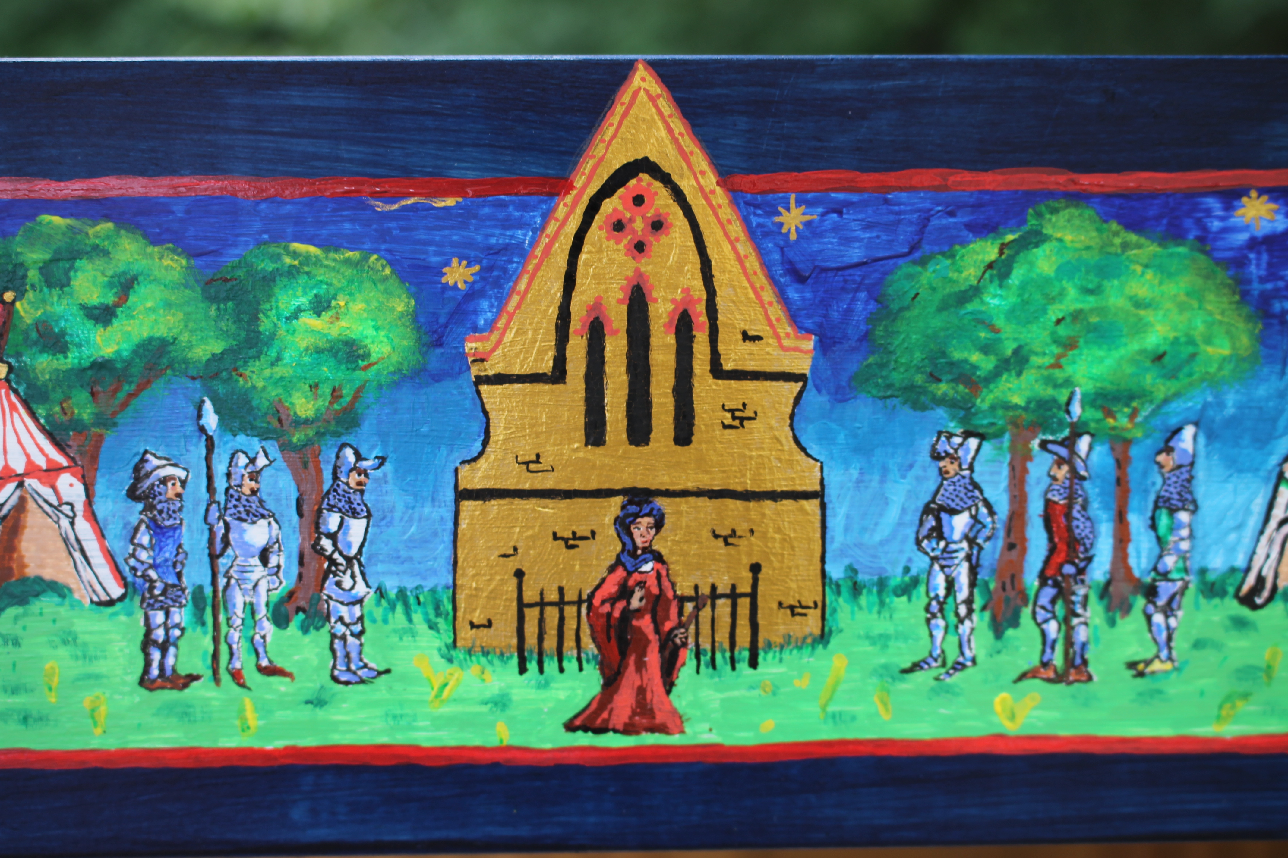I made this stool as a prize for the Save DeKoven Fundraiser to help preserve the DeKoven Center, site of the Western Martial Arts Workshop. The basic form is inspired by a 15th century stool currently located at the Cloisters in NYC. The decorations are inspired by early 15th century art while simultaneously honoring the DeKoven center. The seat was hand carved and painted and gold leaf was applied to various areas.