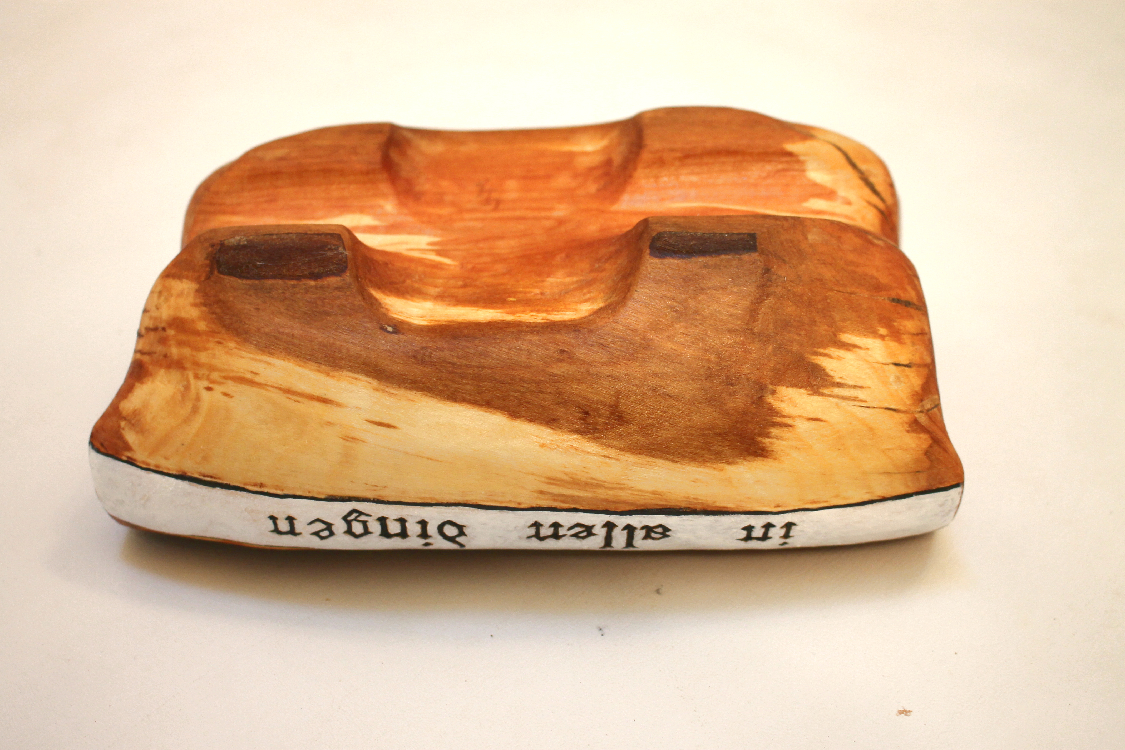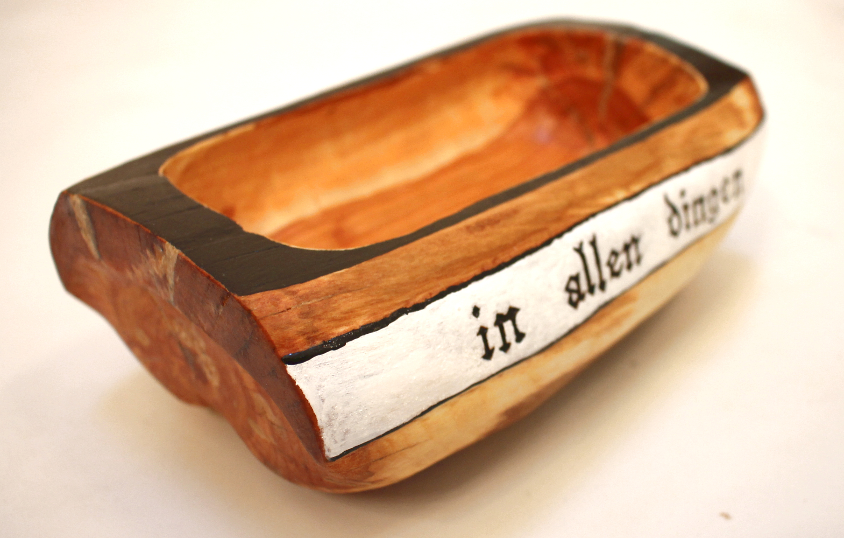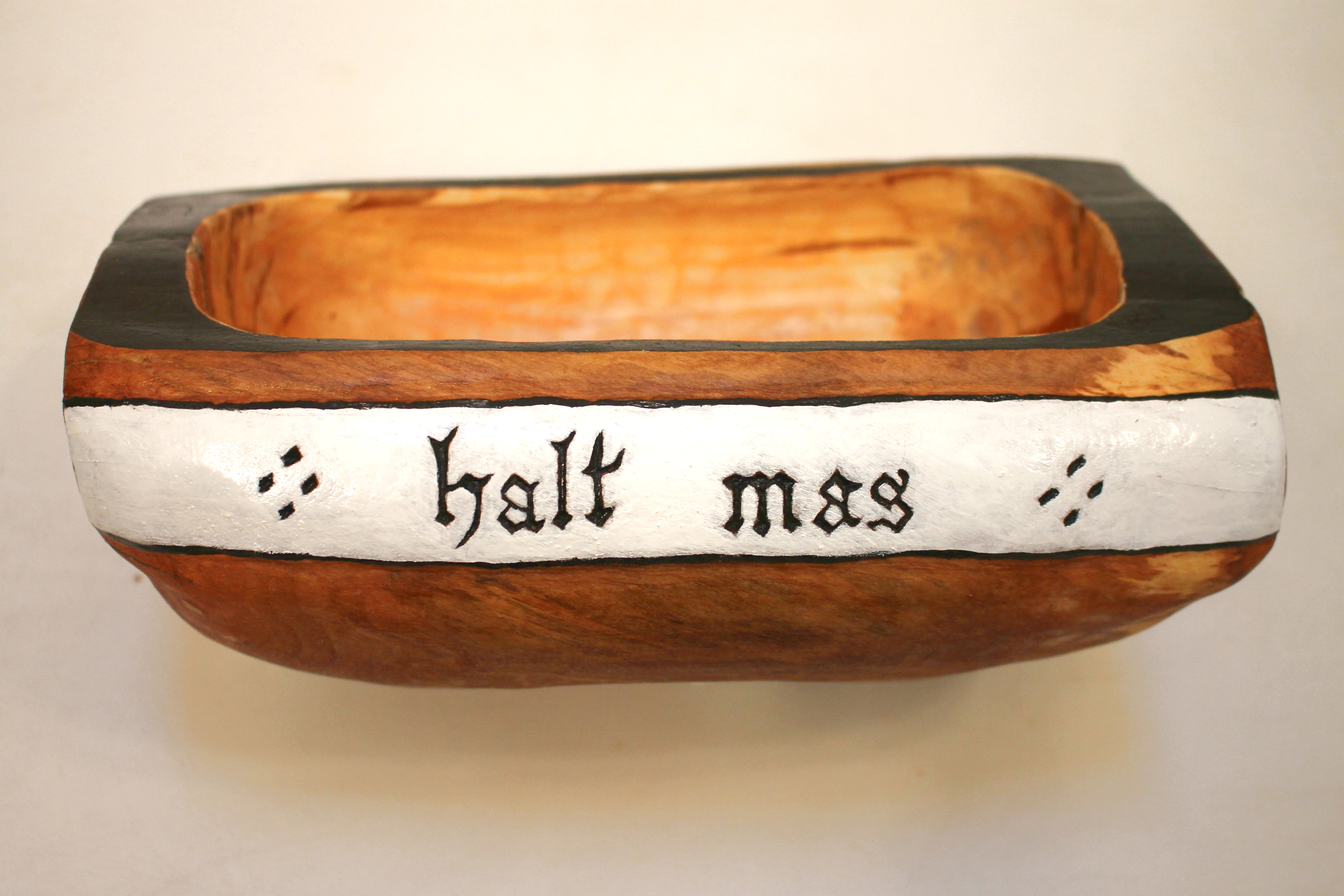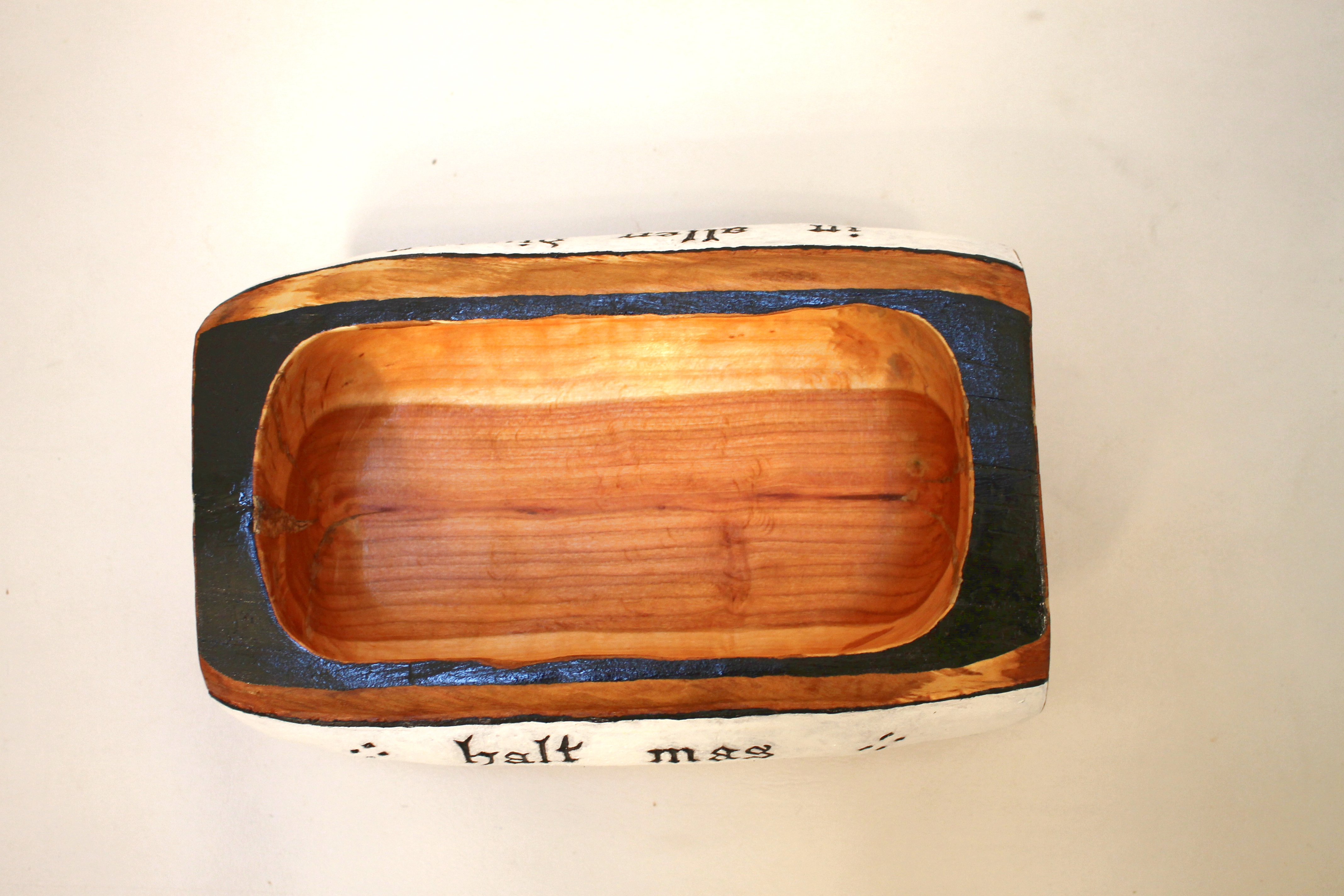 This wooden serving bowl is carved with the inscription “Halt mas in allen dingen“, or “Moderation in all things”. This was the motto of Holy Roman Emperor Maximilian I… and it also struck me as a humorous reminder to put on a bowl of food. The bowl was hollowed from a single log of birch, and the writing and banner was carved and then covered in black and white enamel. The bowl was treated with tung oil and buffed with beeswax for moderate water resistance. This treatment is completely food safe.