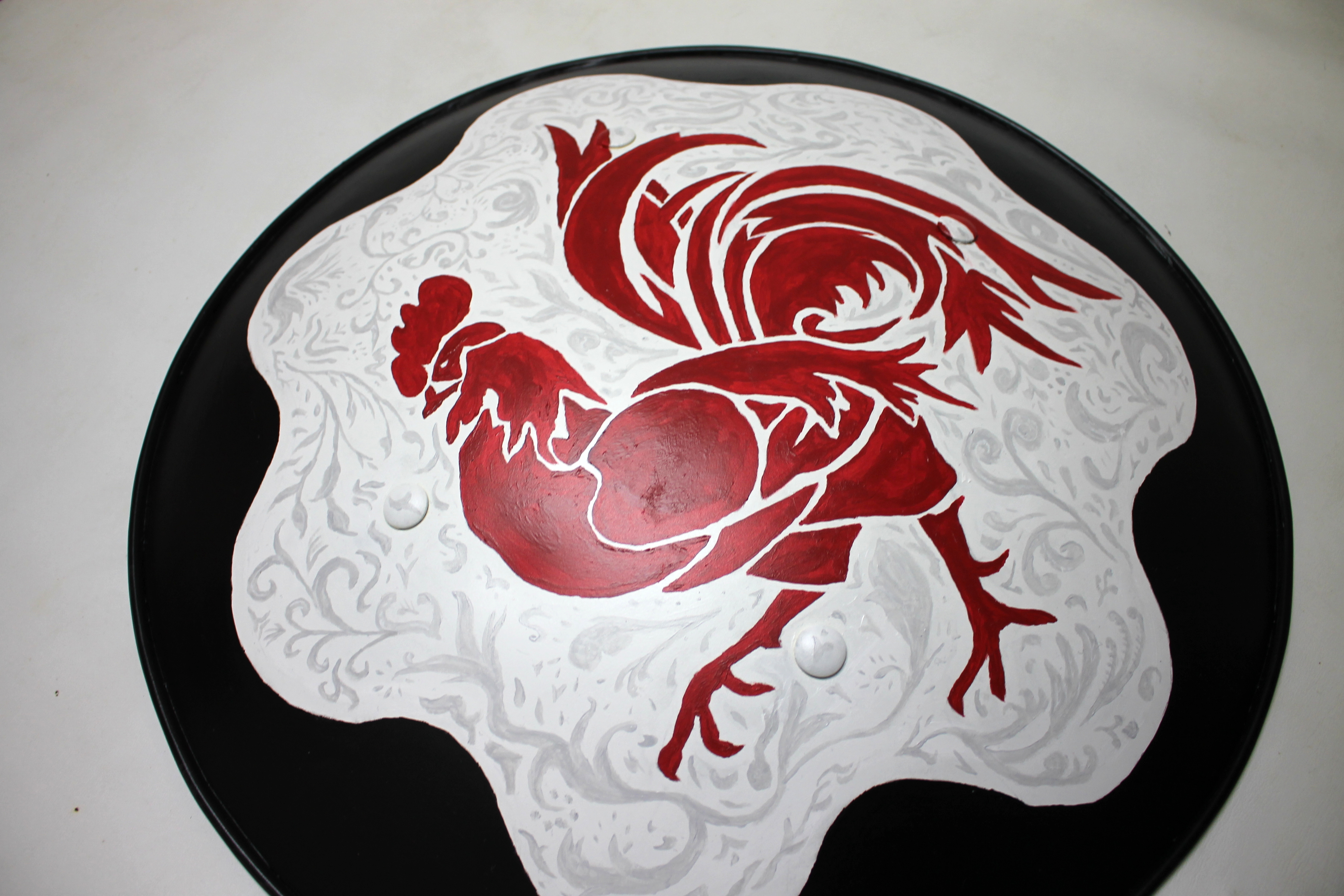 A client hired me to paint his heraldry on a Museum Replicas LTD “Renaissance Shield”. This will be used for Historical European Martial Arts, primarily with the Bolognese Partisan and Rotella techniques. I used a technique called diapering on the white field, which is where a darker shade of the same color is used in a design to provide visual interest without disrupting the rules of color of the heraldry. The original image has a bridge that the client asked me to omit.