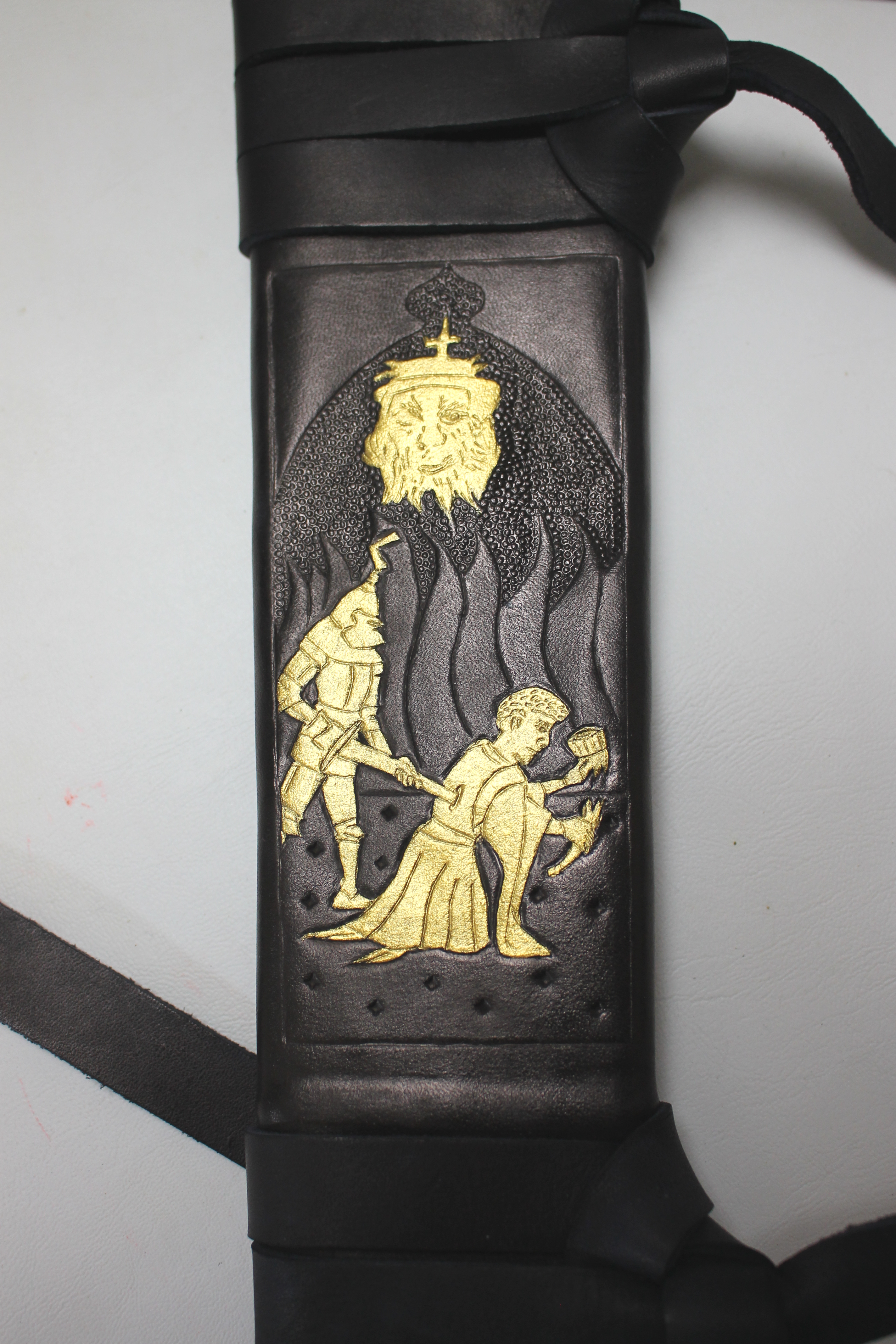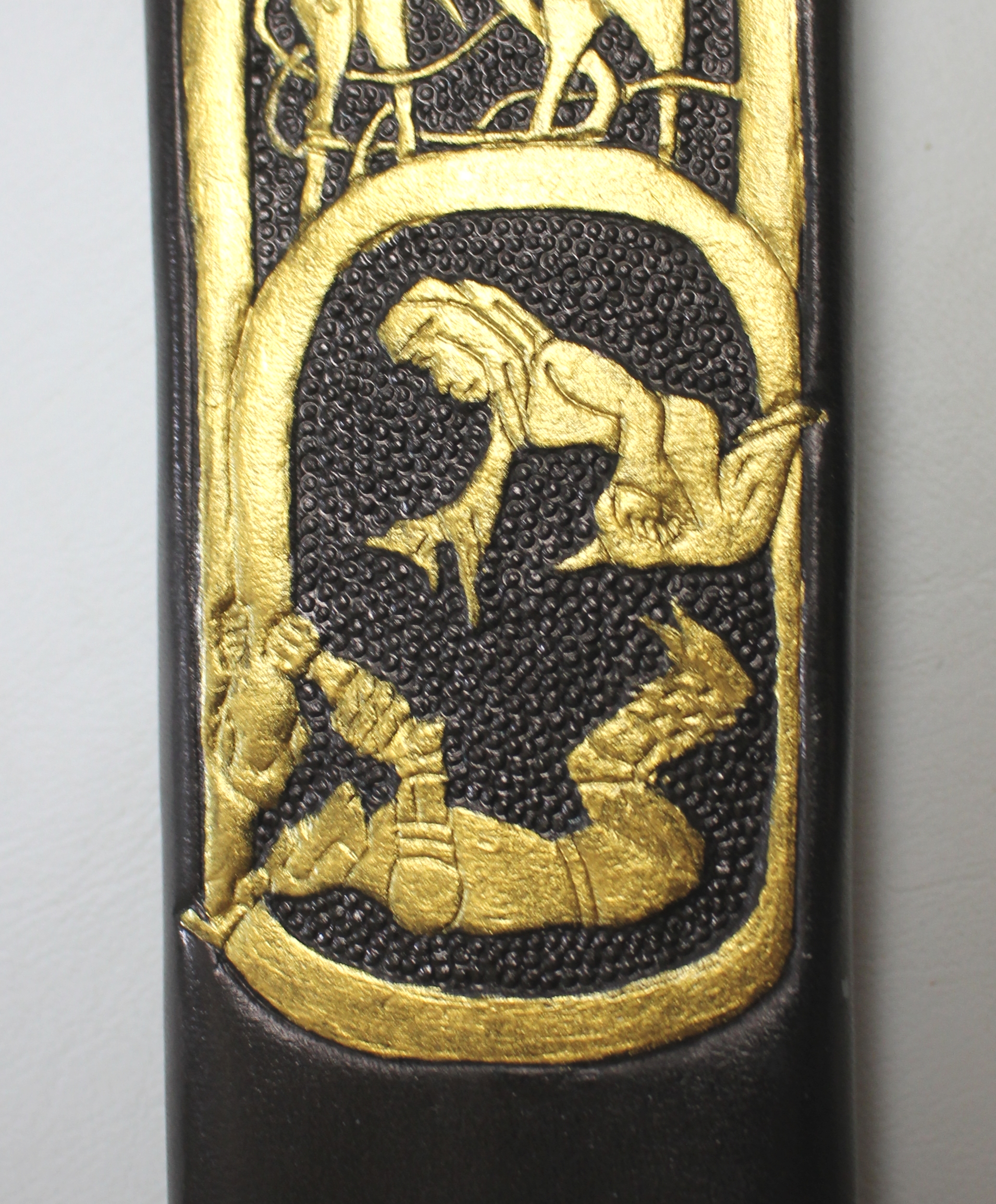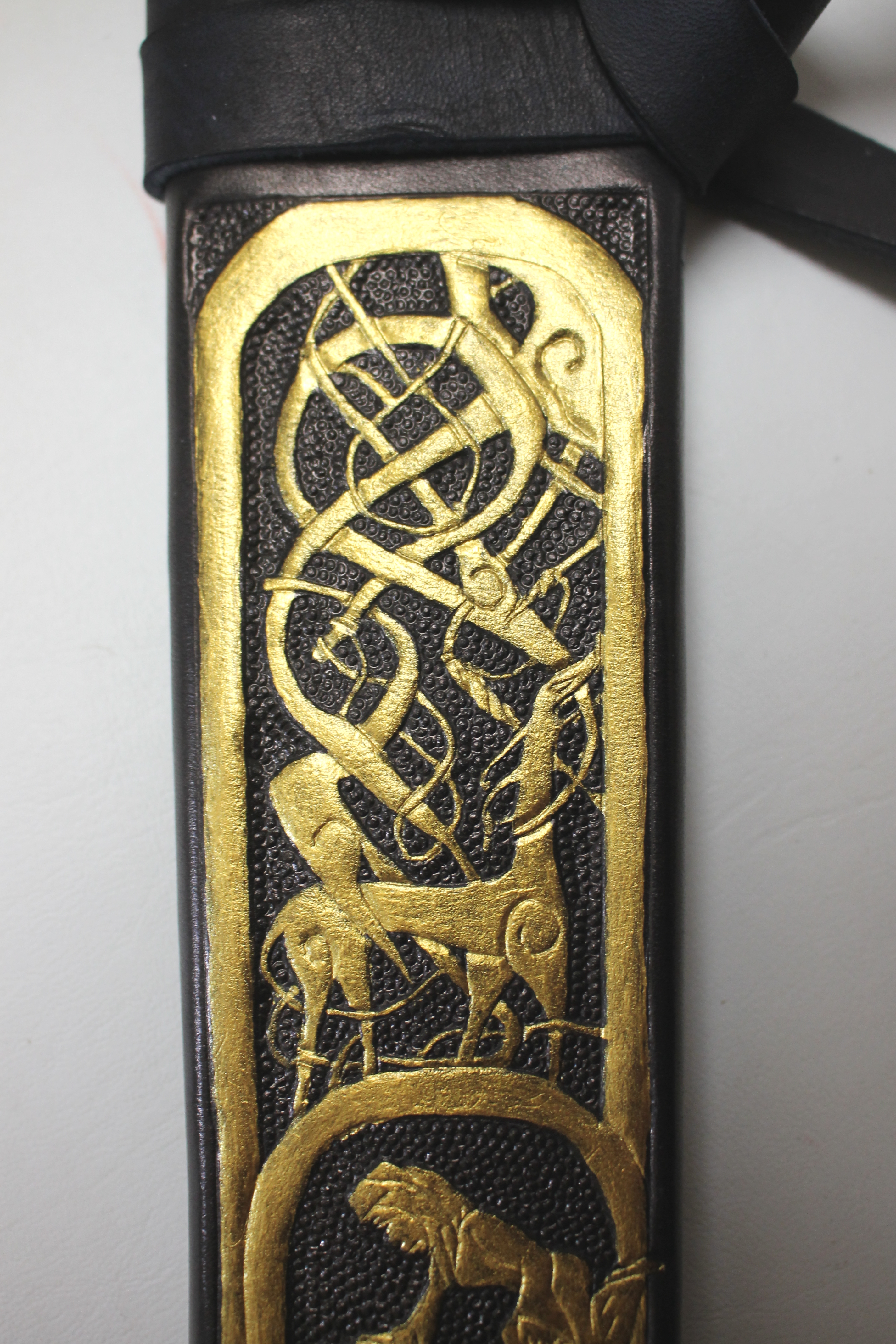 -We have depictions of these myths in the 14th and the 16th century, but for some reason there unfortunately is a black hole of information on these myths during the 15th century. For this scabbard, I decided to draw from 15th century art as well as earlier period Norse depictions and create a historically-plausible piece, where Loki was “updated” to wear early 15th century armor. I imagined being a 15th century artist sitting in front of the Urnes Staves Church and being inspired to tell the tale of Loki’s end days.