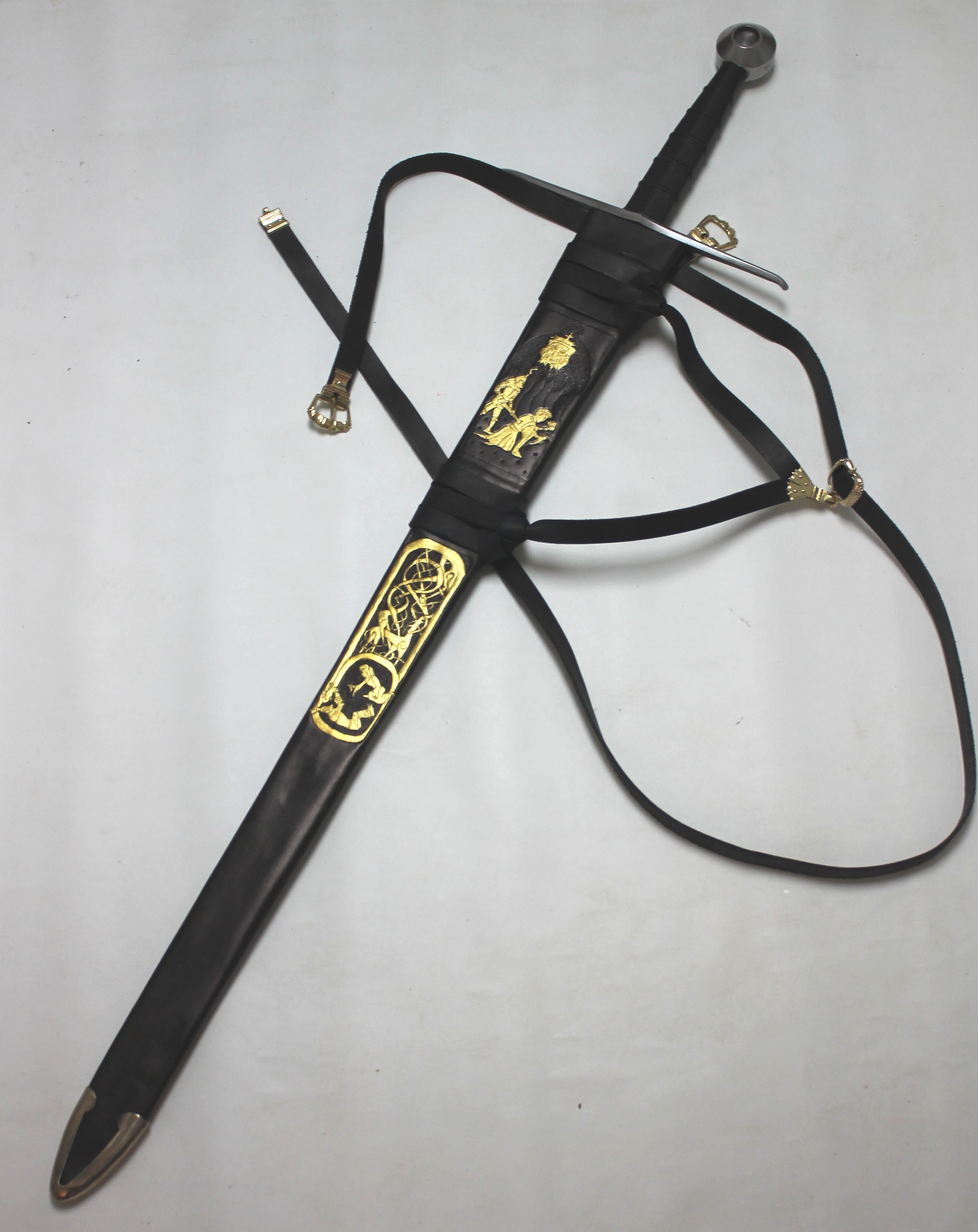 A Loki themed scabbard for an Albion Alexandria longsword. The client had a strong personal reason for wanting to pay homage to Loki, but also is interested in historical accuracy. Norse mythology and this 15th century sword aren’t contemporary with one another, so I started brainstorming the plausibility of Norse imagery being used in 15th century art, and I hit the books and internet. Below is a full explanation of the why I designed the scabbard this way, and what the imagery mean… though you can just skip ahead if you don’t want to read it all!