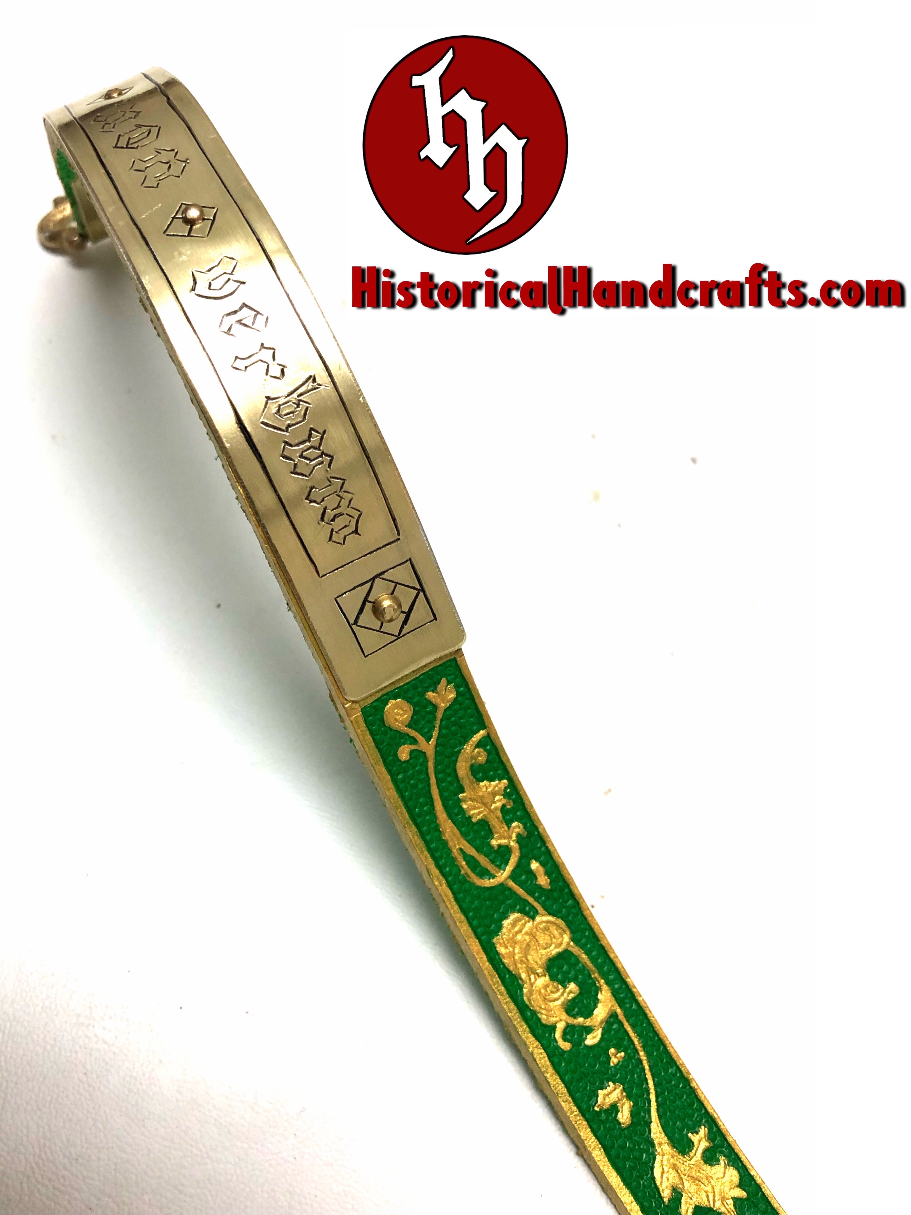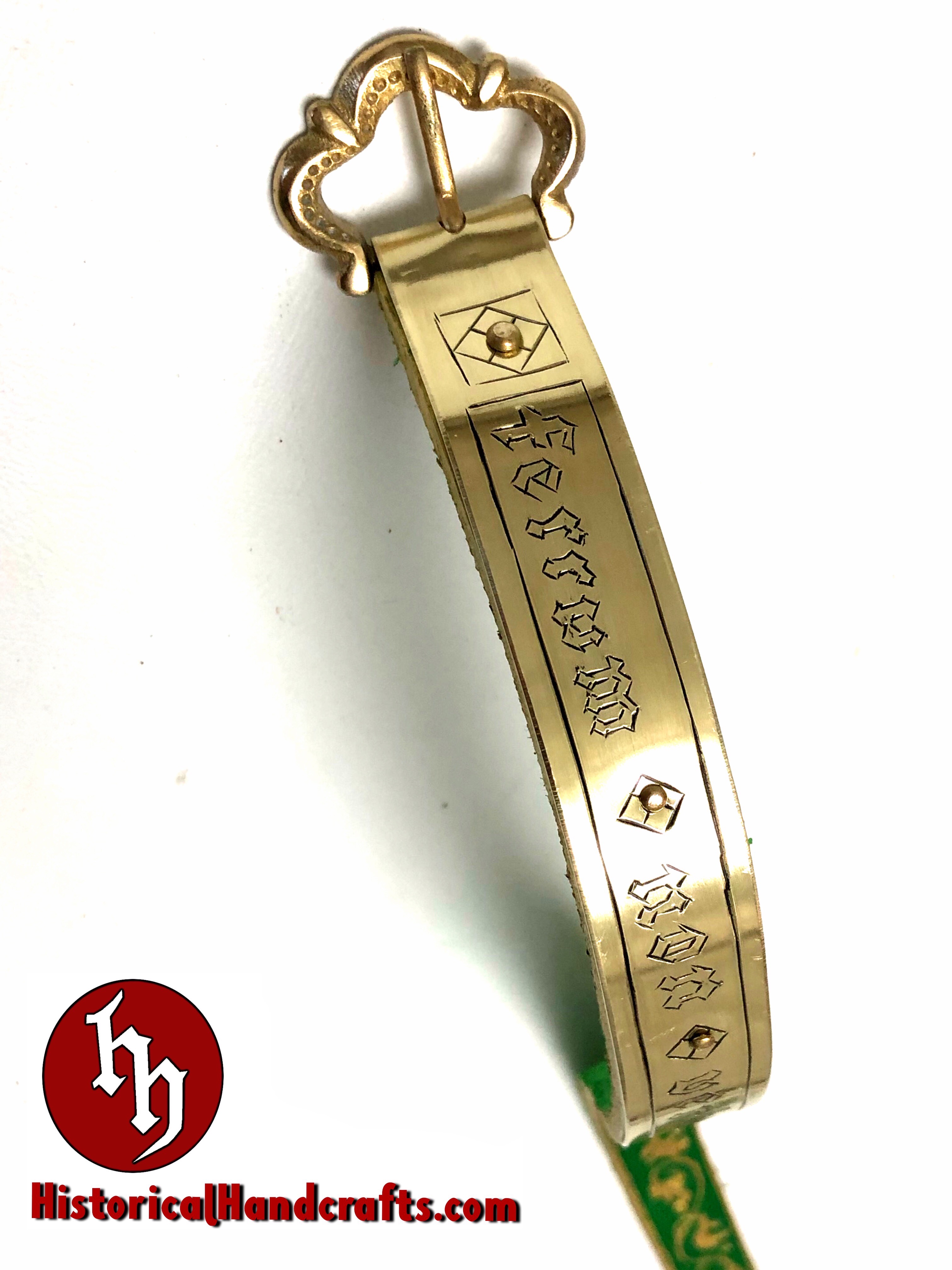 This garter is meant to be worn just below the knee, as was done in the late medieval style. The client who commissioned it is part of a HEMA school that uses garter belts to denote rank, so this will be worn while fencing, and therefore is made of a thick leather for durability. I tooled and painted the leaf pattern, and also made the brass buckle plate. I engraved it with the school’s motto, “Ferrum non Verbum” (Iron, not word).