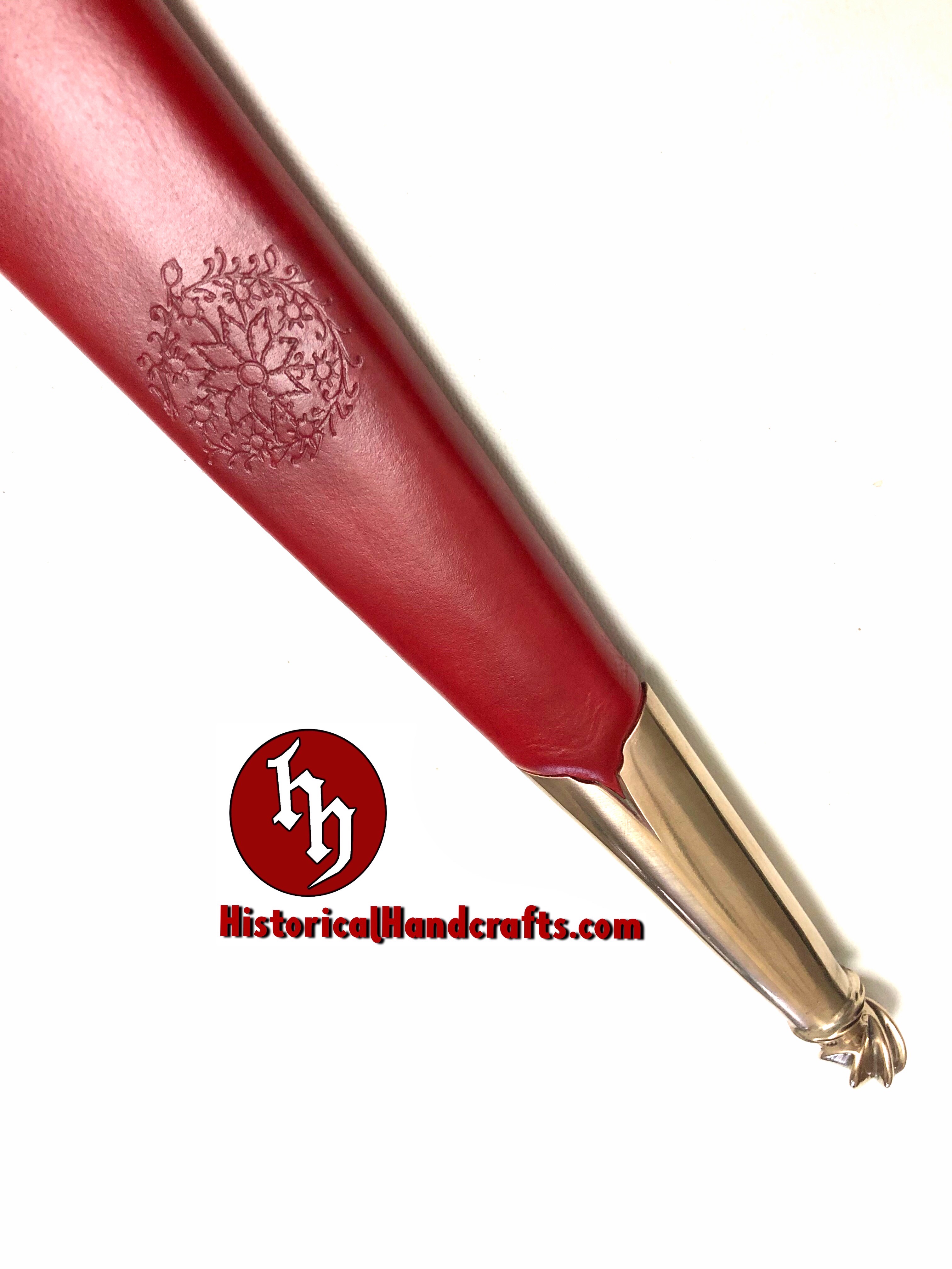 This scabbard was made for a client who will use it for living history. His focus is the late 15th century in the Holy Roman Empire. He asked about the possibility of using period decorations that had a connection to his Jewish identity that would be subtle enough not to stand out (given the mistreatment of Jewish people at that period and place).