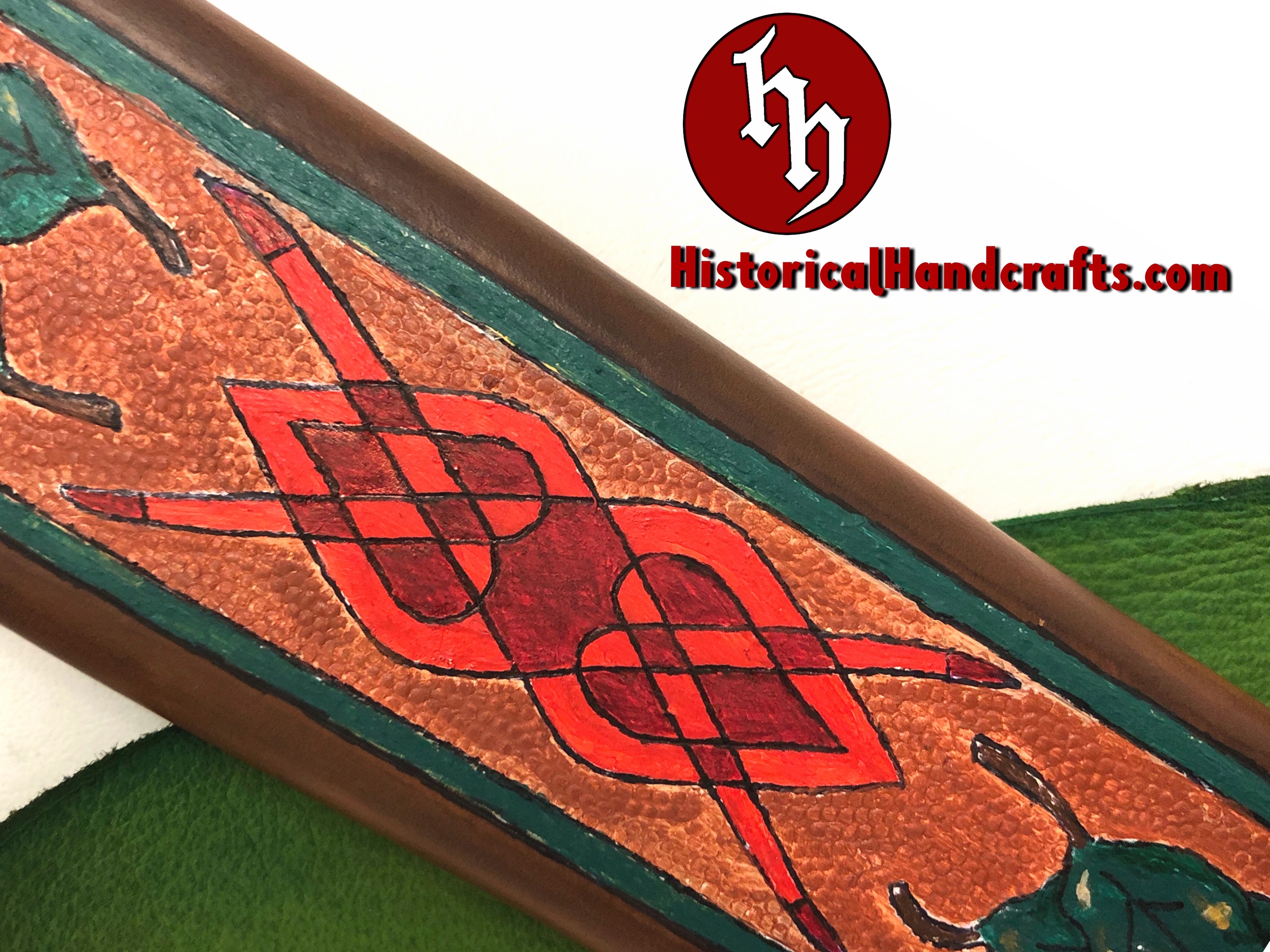 The face of the scabbard is tooled and painted with images relating to the show. The deer head reflects the garb of Herne the Hunter; the heart “rune” mirrors the one engraved on the sword blade; the oak motif is because Sherwood Forrest is known for its oak trees. At the mouth of the scabbard is a brass decoration that is meant to subtly imply the look of an arrowhead.