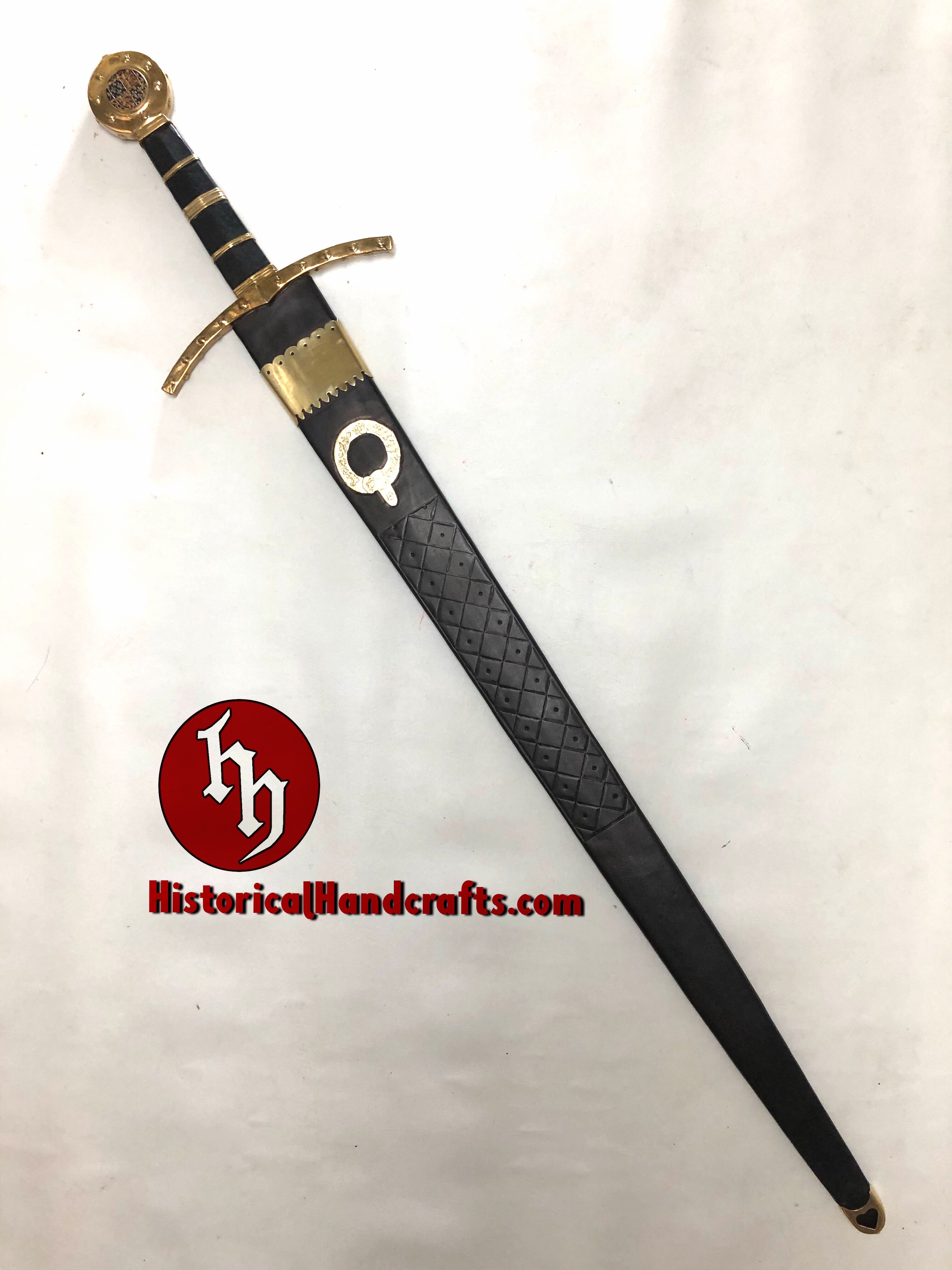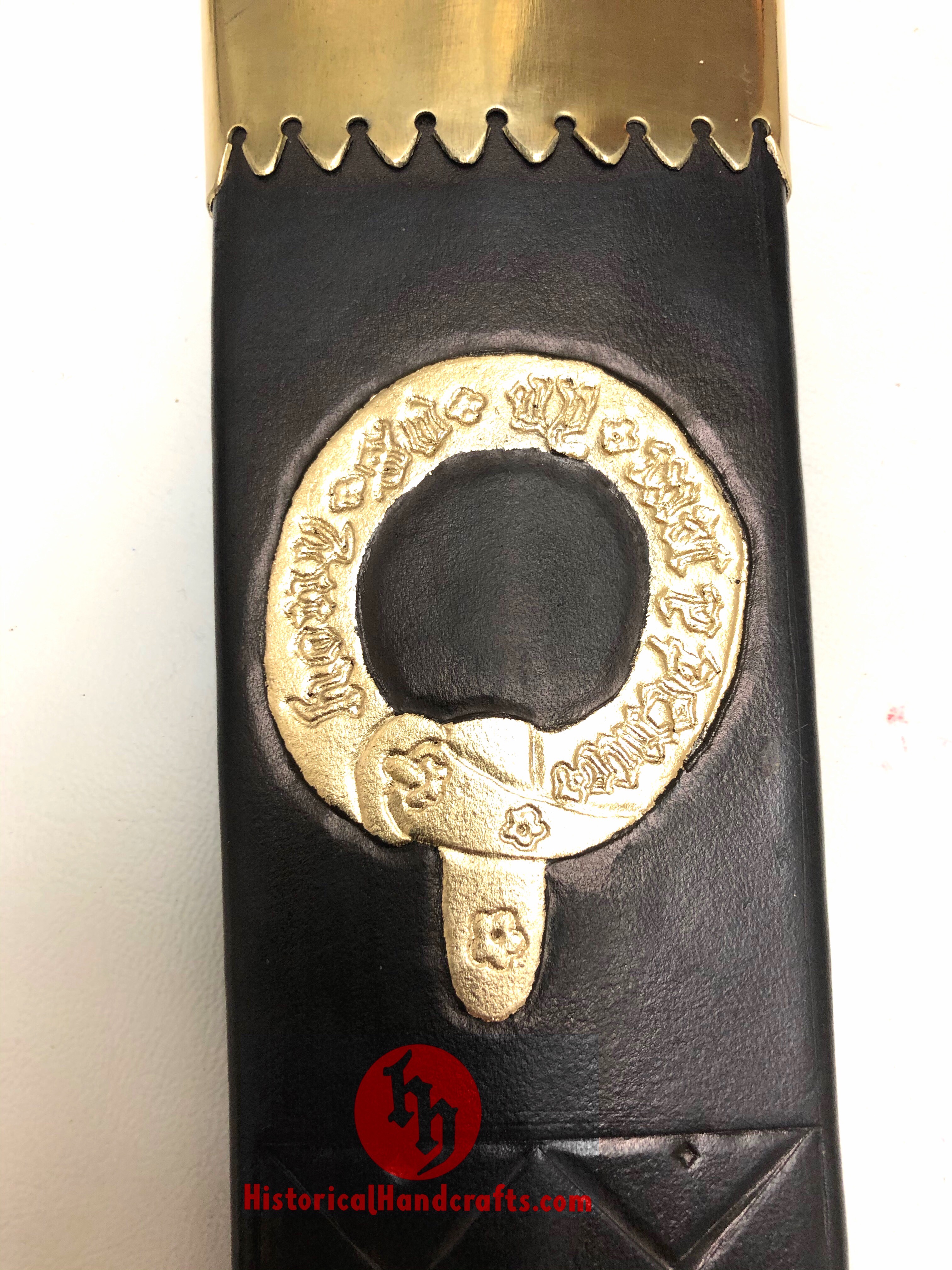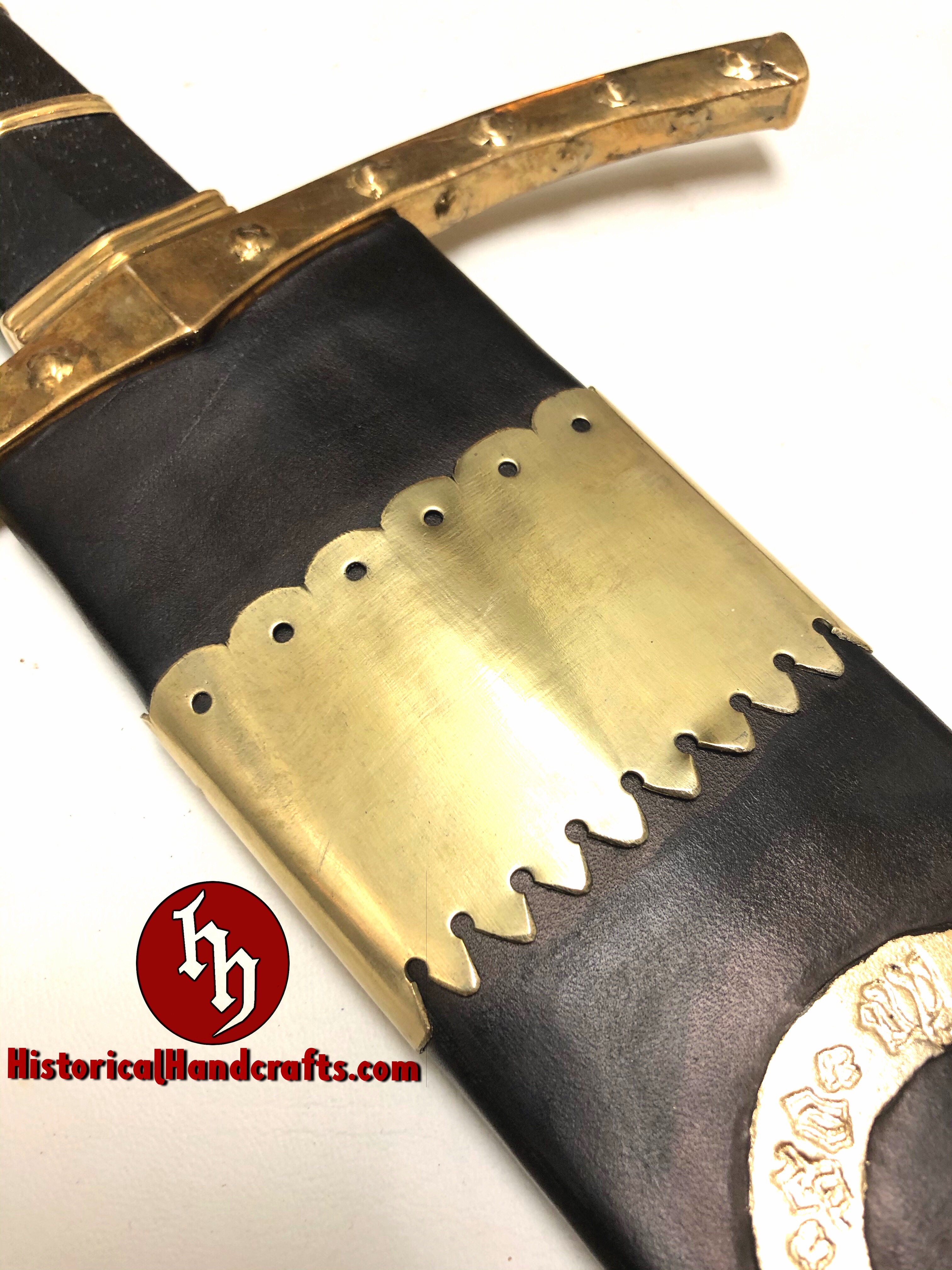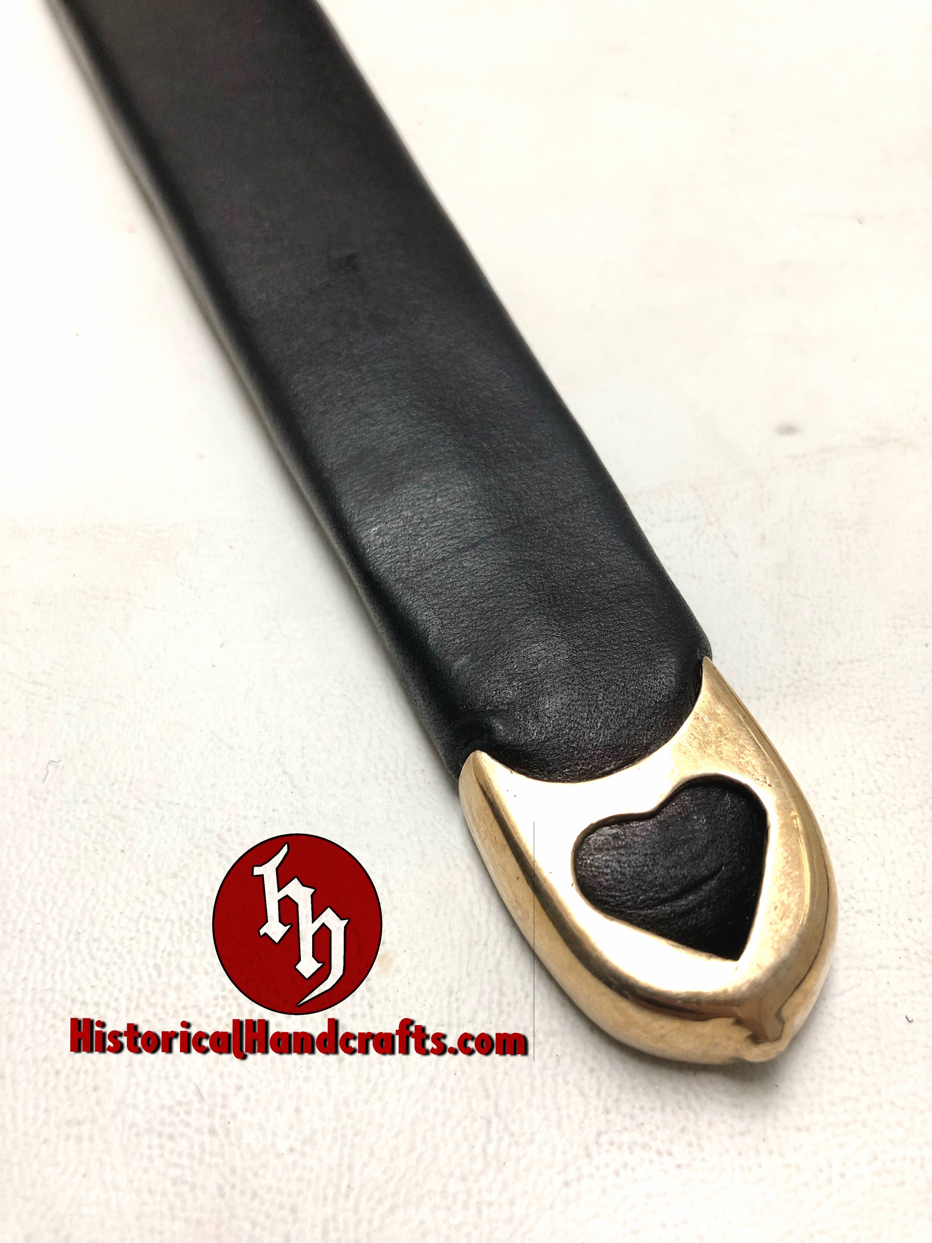 This scabbard is for an Arms and Armor Edward III Sword. The original that it is based on has the symbol of the Order of the Garter on the blade, and the scabbard mimics this insignia tooled into the leather and covered with gold leaf. The symbol is flipped on the scabbard vs the blade, as the sword unsheathed would be viewed with the point upward, but sheathed it would be downward. The brass locket is made by myself; the bronze chape was made by HandmadeRevolution.org.