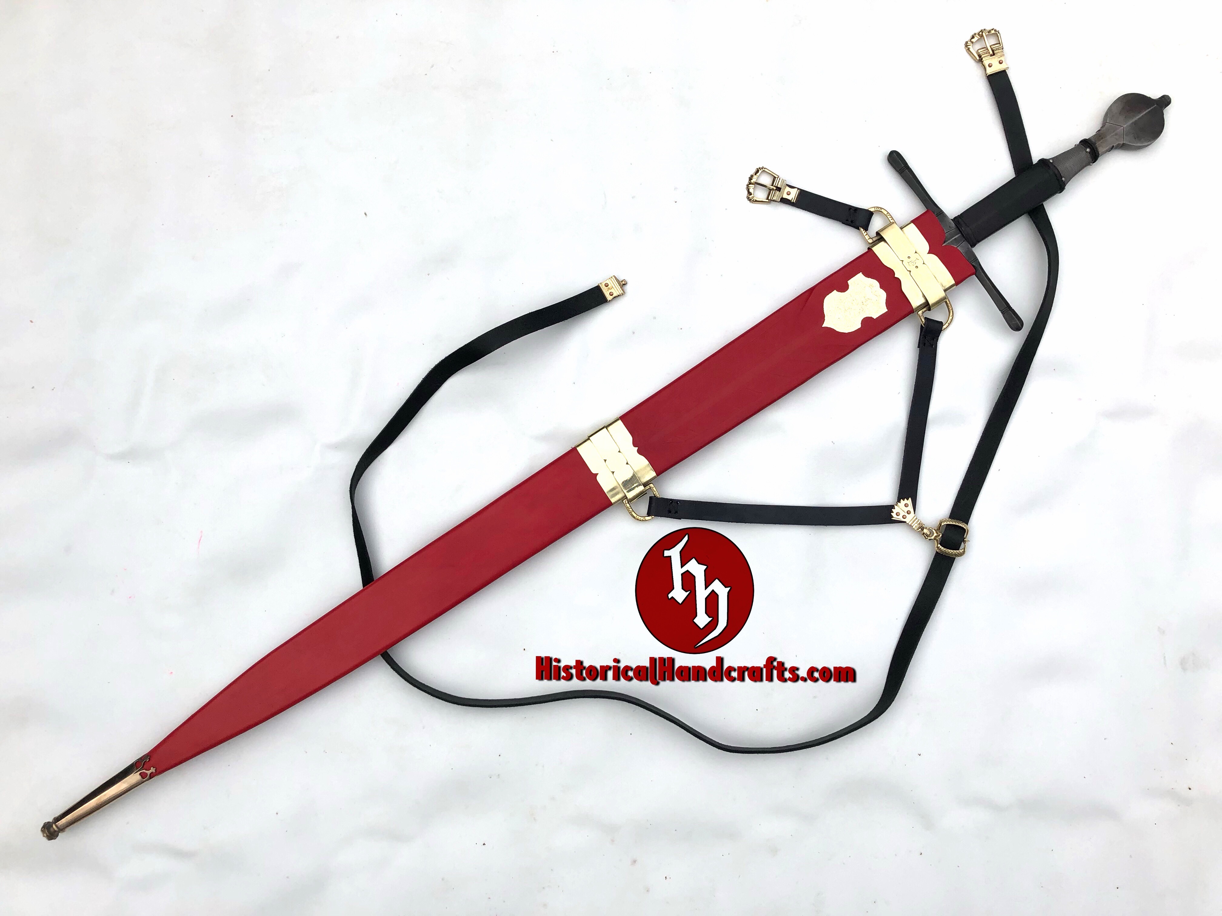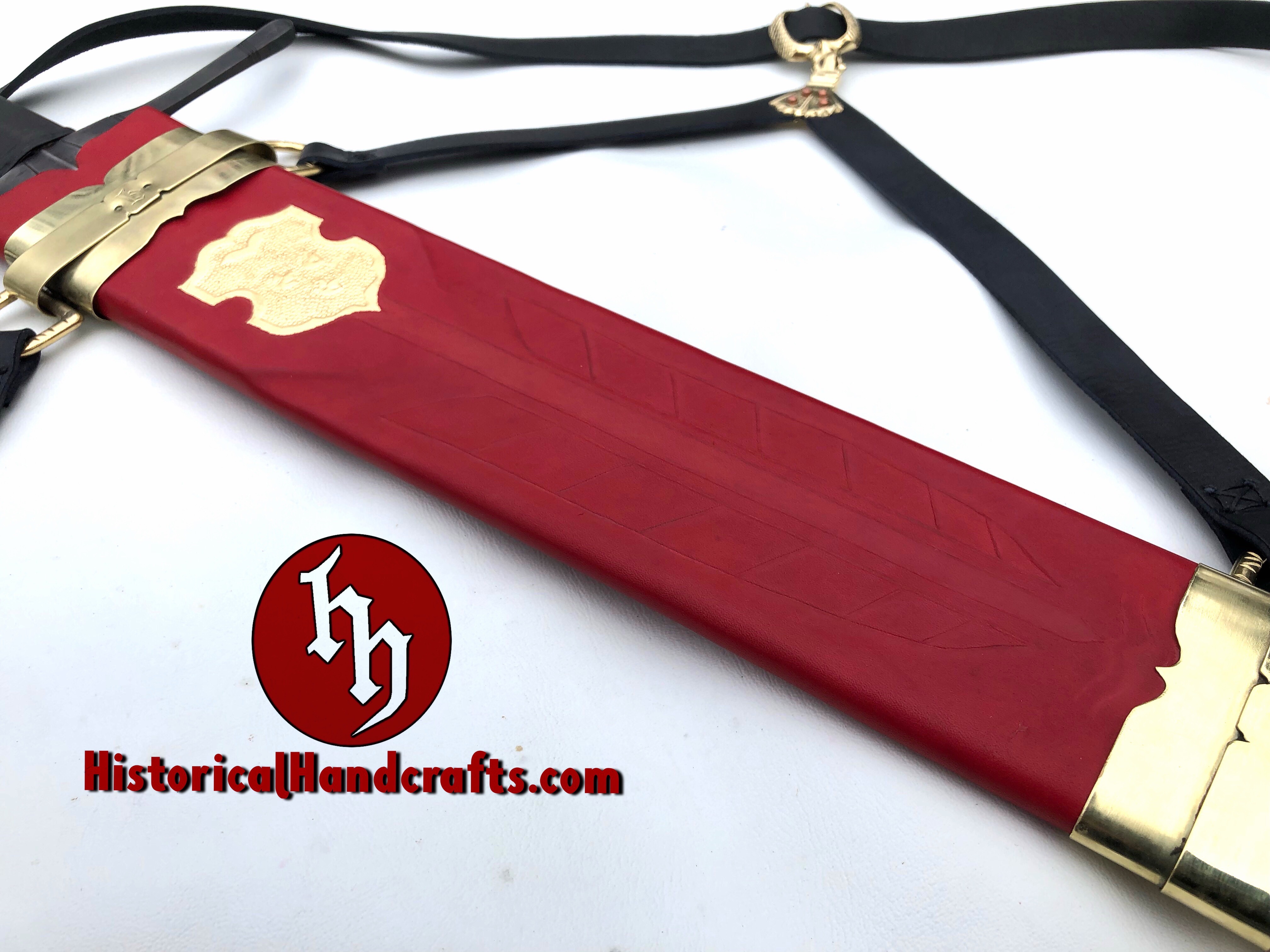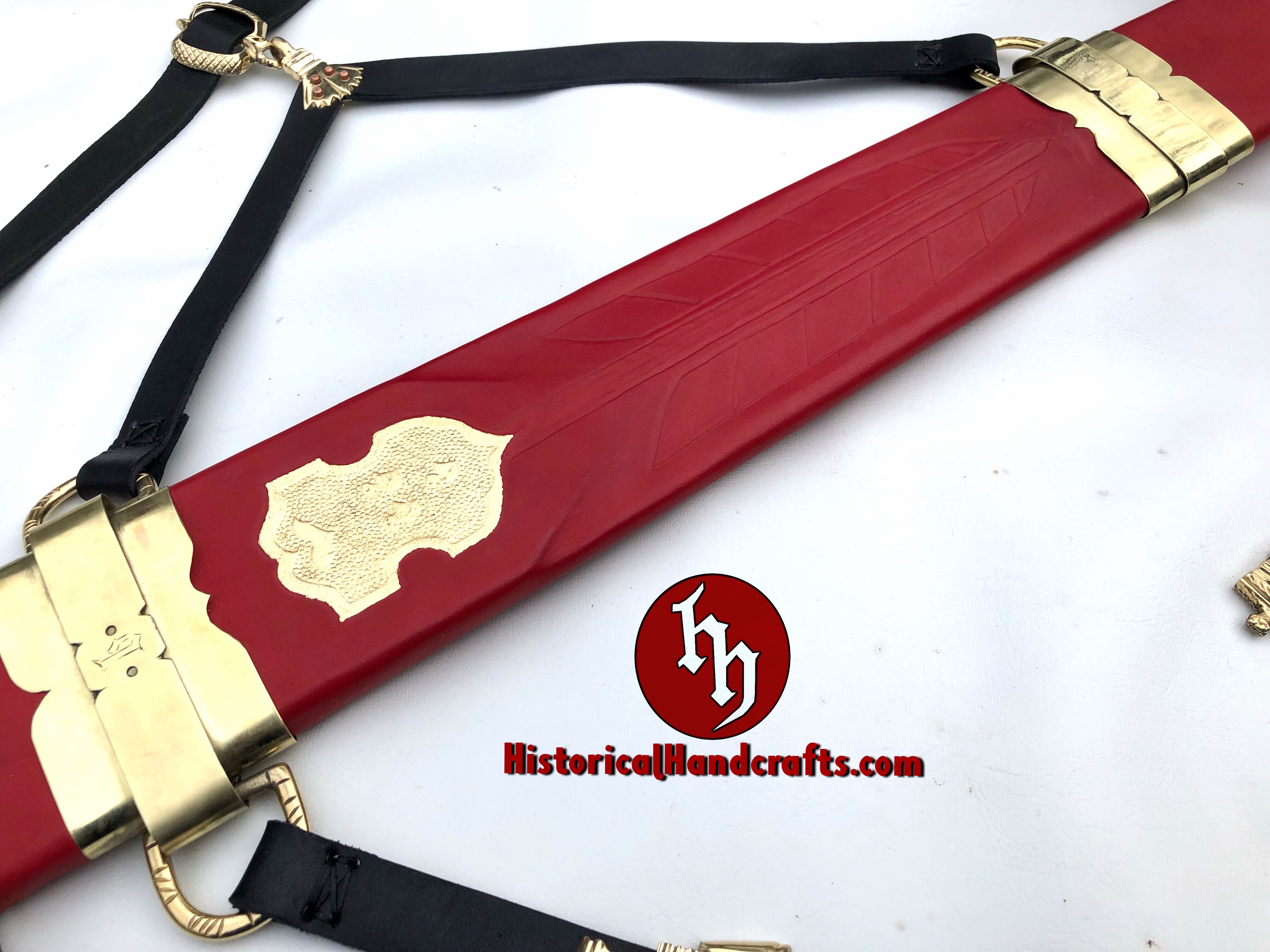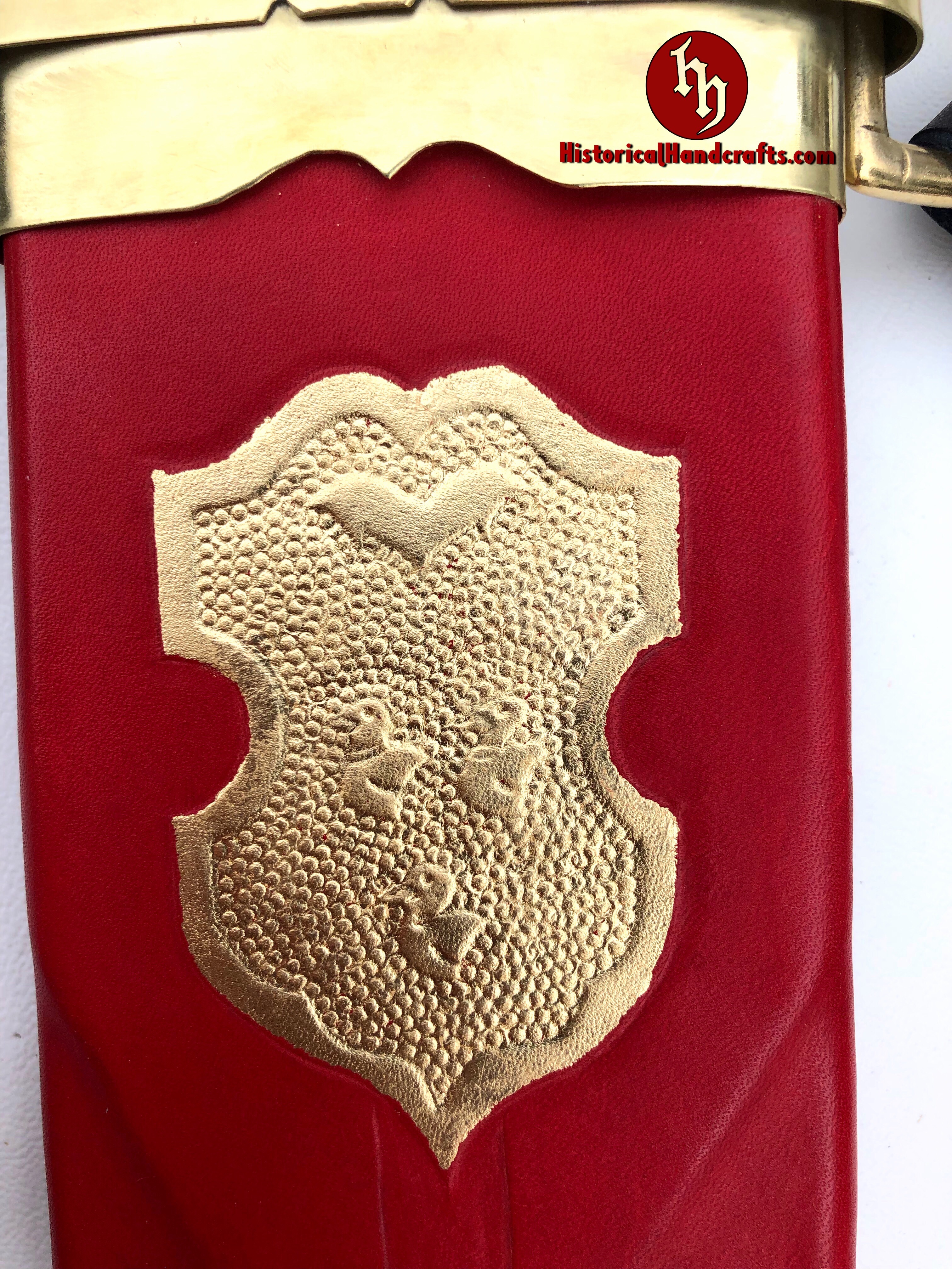 The owner of this longsword wanted his family crest displayed on the scabbard. I tooled it into the leather and applied gold leaf. When I made the brass lockets, I also hand engraved the letter “b” into the upper one, the client’s monogram.