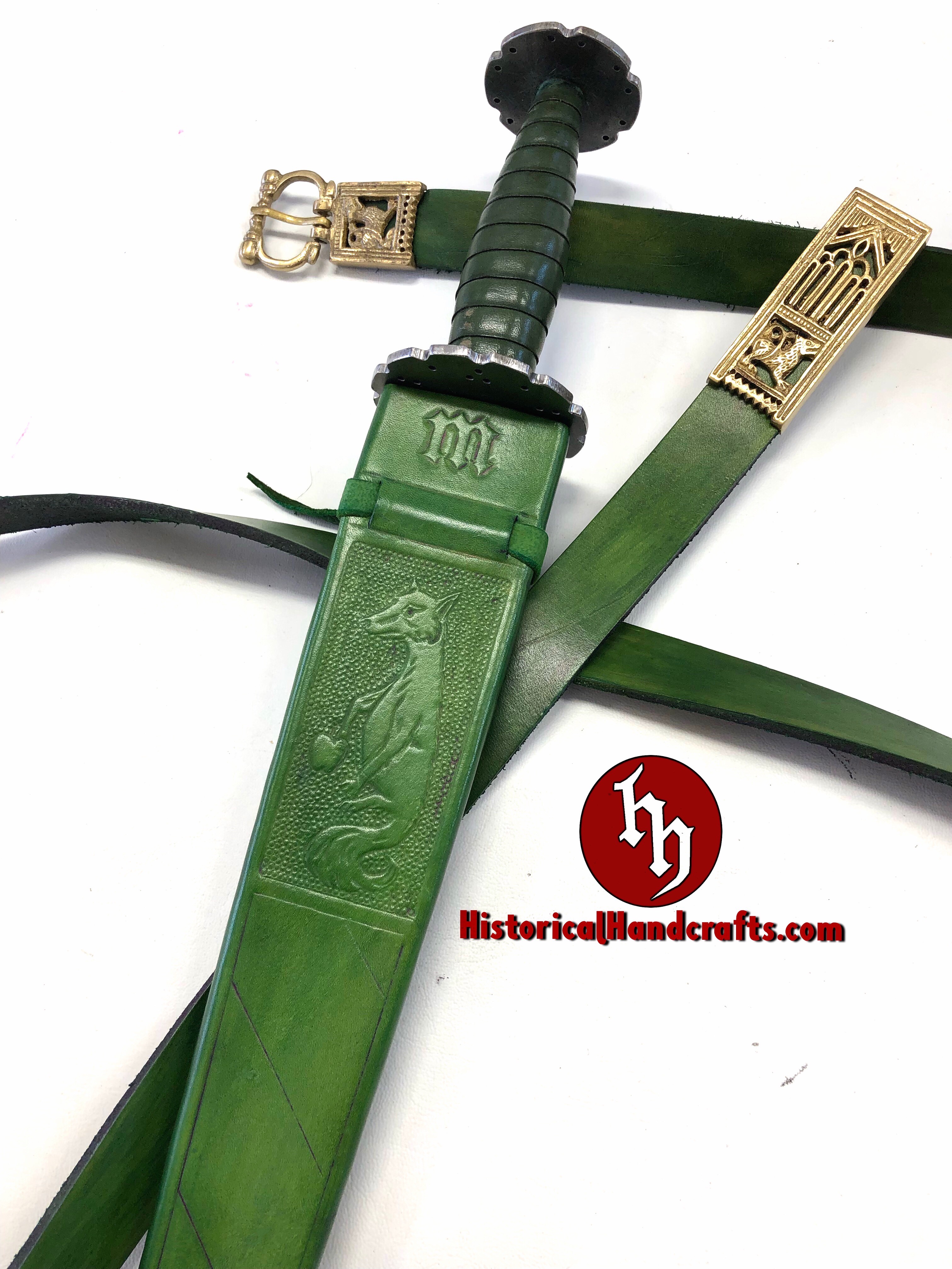 The owner requested that the sheath have a fox and an apple on it, and I based the fox off of several medieval bestiary illustrations.