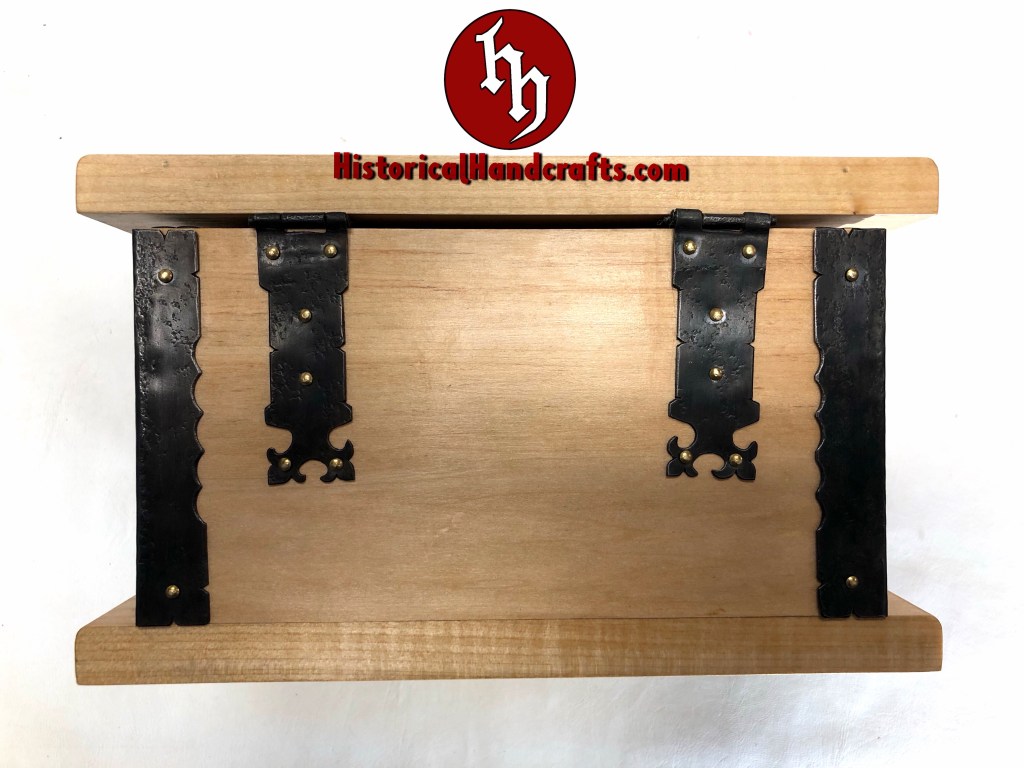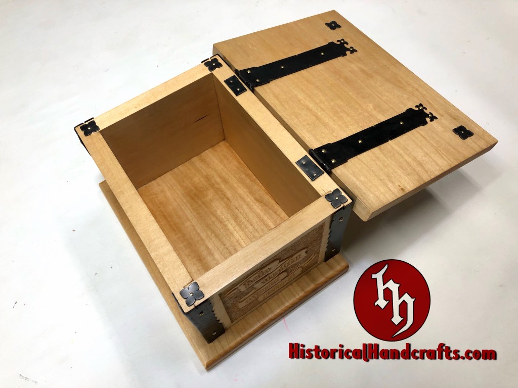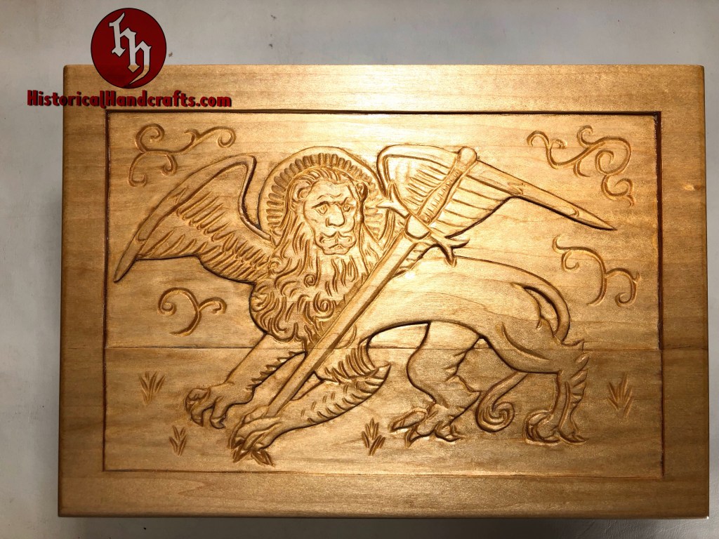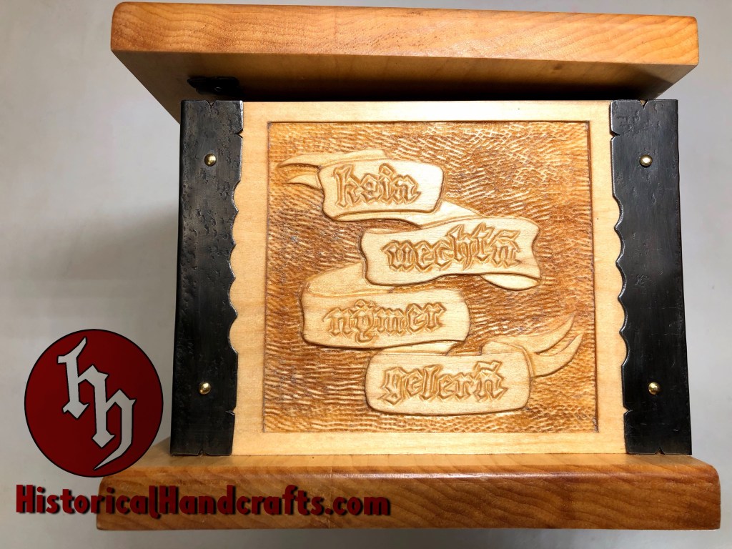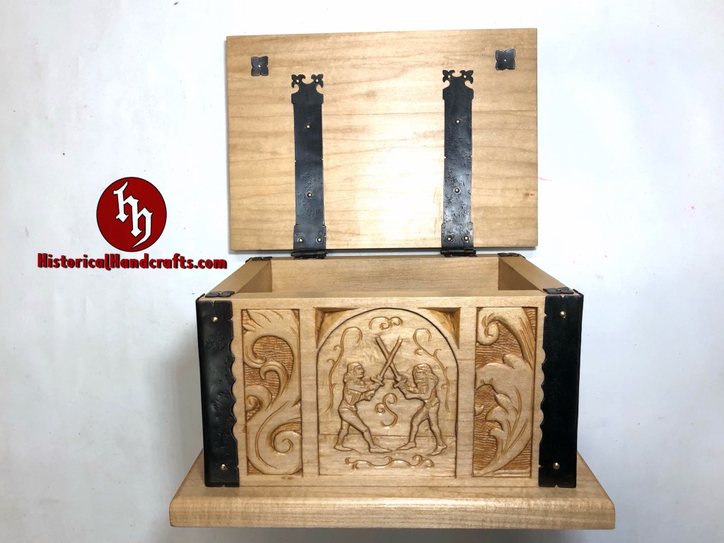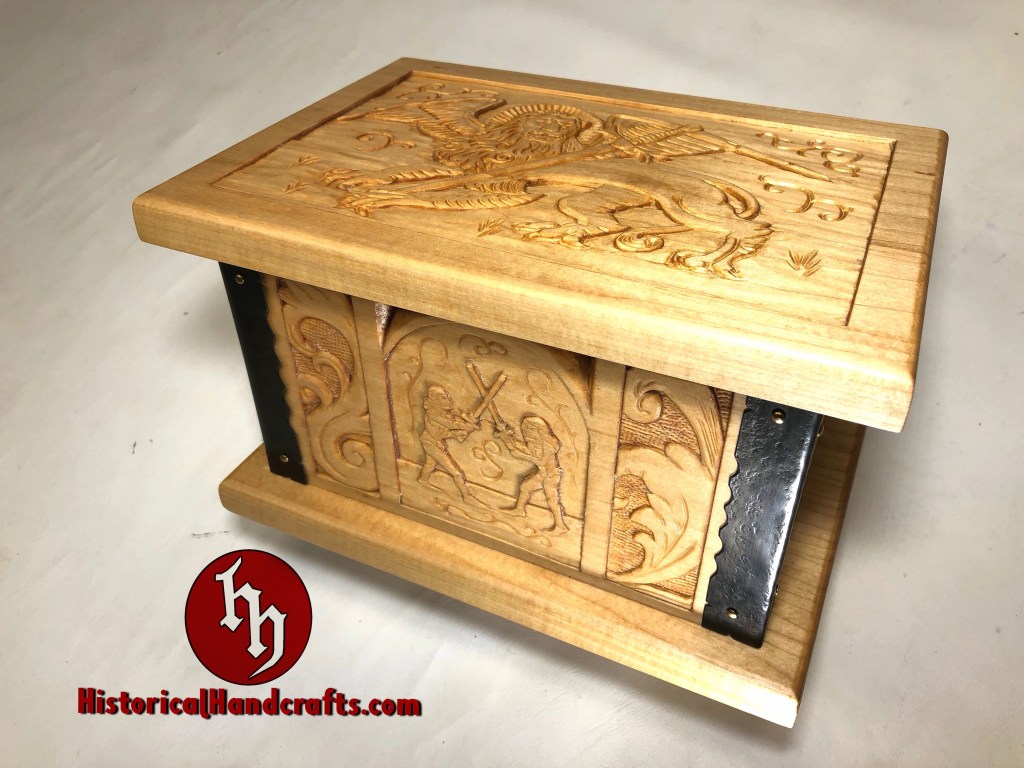 The Marxbrüder (Brotherhood of Saint Mark) were a German fencing guild founded in the 15th century. This box is hand carved with imagery taken from period fencing treatises and topped with the Lion of Saint Mark, the symbol of the Marxbrüder. The scrolls on the sides quote a verse from fencing grand master Johannes Liechtenauer, whose rhyming verse served as a mnemonic device to memorize lessons. This particular verse warns that the cowardly should learn no fencing, though it is more lyrical in the original language (Der schrickestu gerñ/kain uechtñ nÿmer gelerñ).
