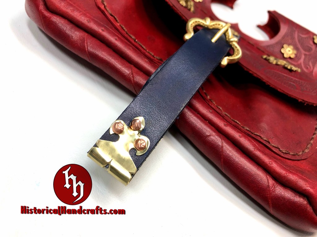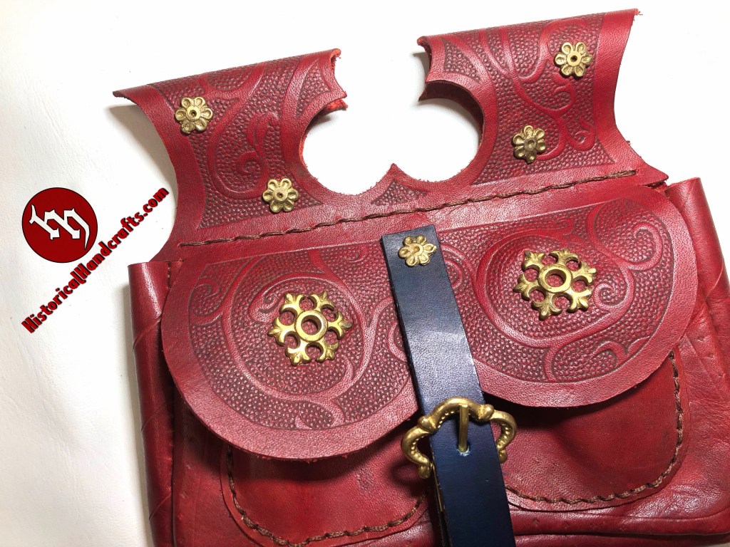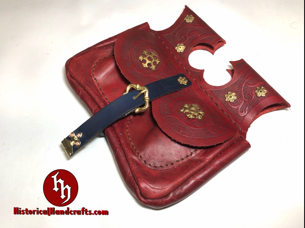 One of the greatest mysteries of mankind is how people managed to get by for so many centuries before deciding to invent pockets. Throughout history purses like this were worn on the belt to carry one’s belongings. This late medieval one has one large and two small compartments for the wearer’s needs. Made of veg tanned leather, it was tooled with floral designs and brass accents.